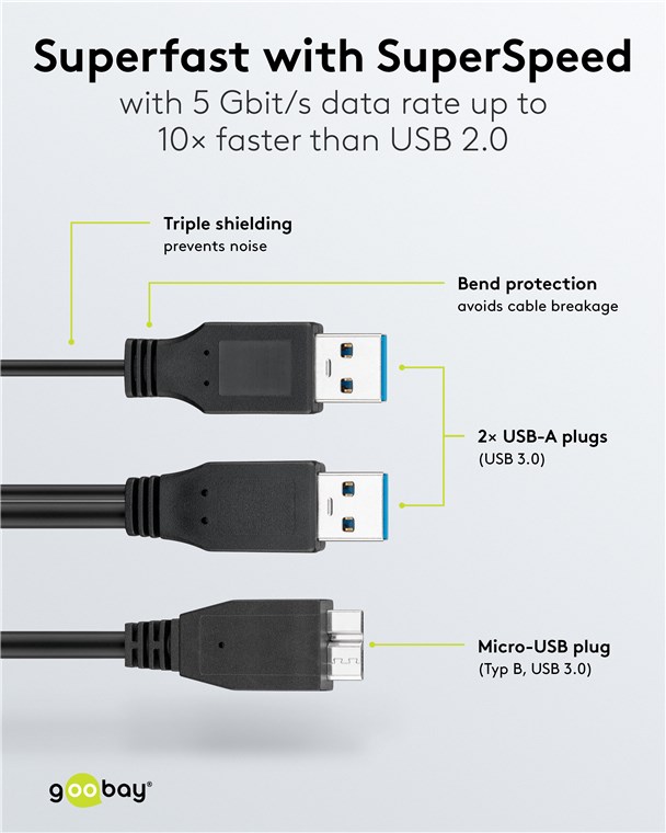 5 Gbit/s, USB 3.0, 1x USB Micro-B plug > 2x USB-A plug