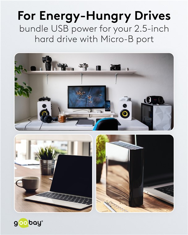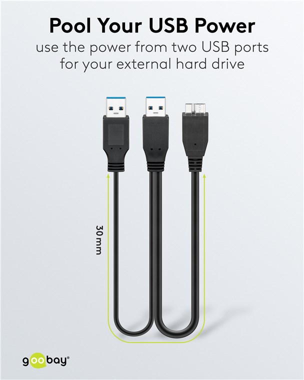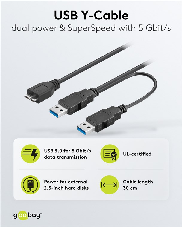 • Y-adapter for bundling the electrical power of two USB-A ports, e.g. for energy-intensive devices such as external 2.5-inch hard drives powered via USB