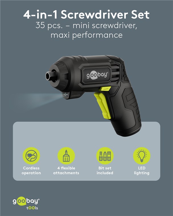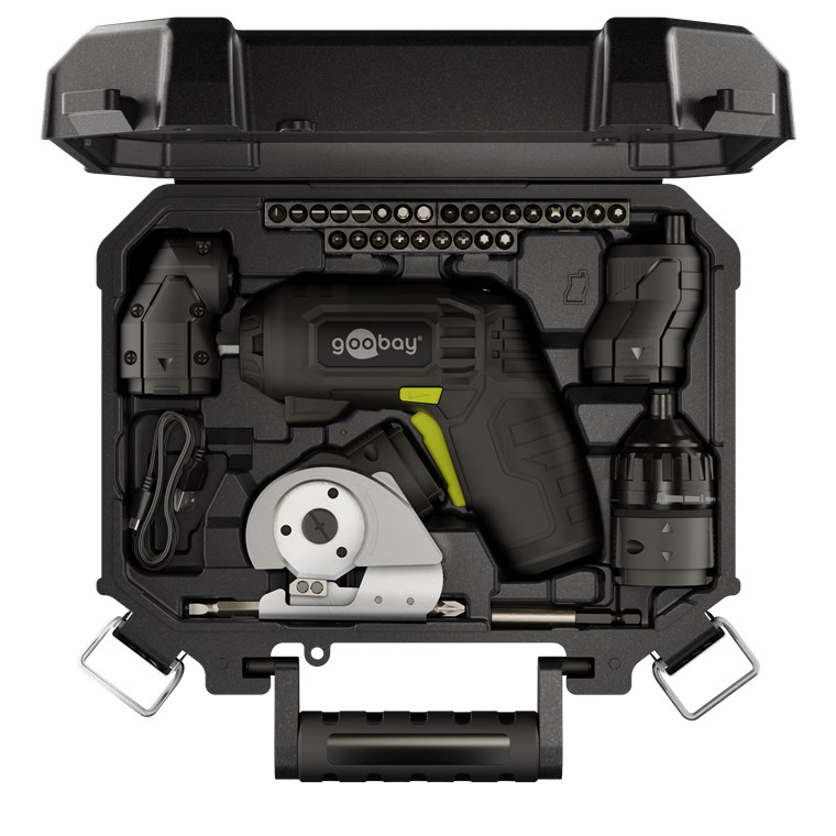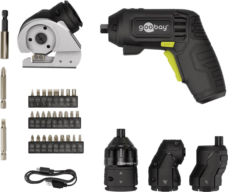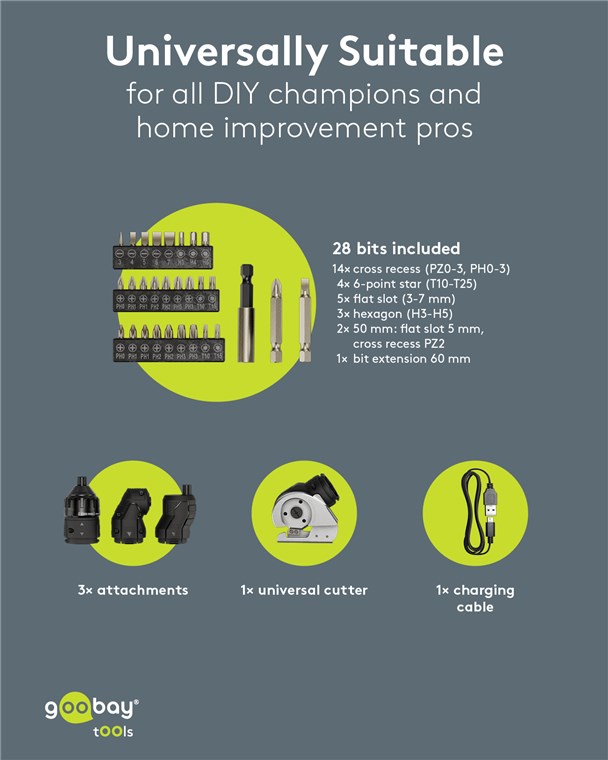 27 bits, 4 different attachments, bit extension, charging cable USB-A to USB-Câ„¢, Cordless screwdriver, storage box