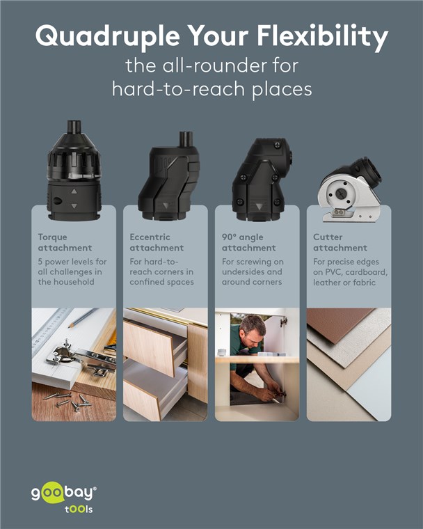 • 4 flexible attachments for hard-to-reach places: 1x 90° angle attachment, 1x eccentric attachment (offset bit holder for corners), 1x attachment with 5 torque settings, 1x universal cutting attachment