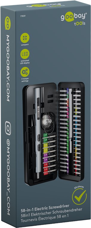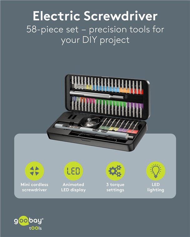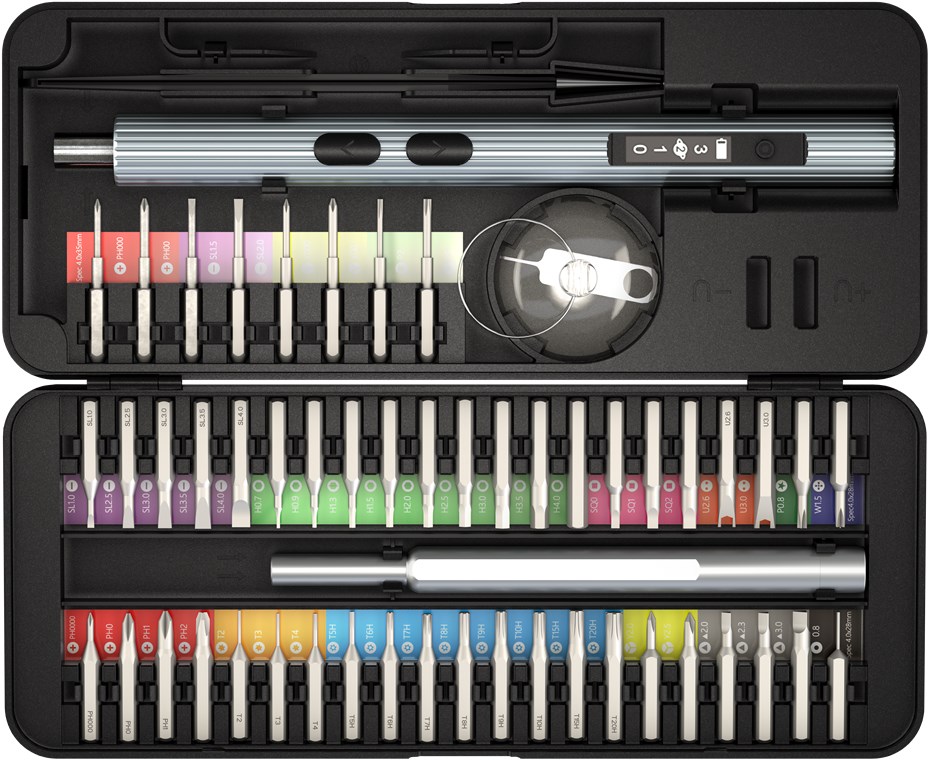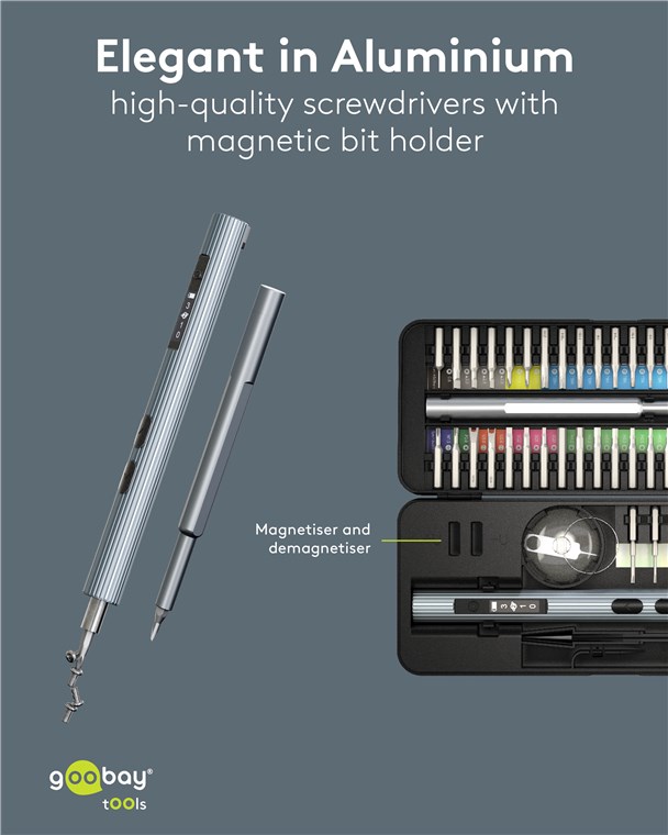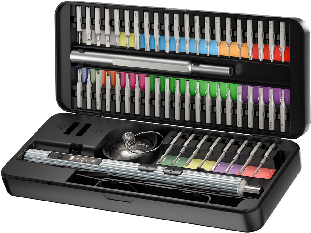 Quality meets function: The electric screwdriver impresses with its elegant metal design and comfortable handling. The notches in the handle provide an anti-slip effect and optimised force distribution when turning the screwdriver manually. The colour-coded metal case and extensive accessories make the mini screwdriver set a must-have for every mobile phone repairer and DIY champion.