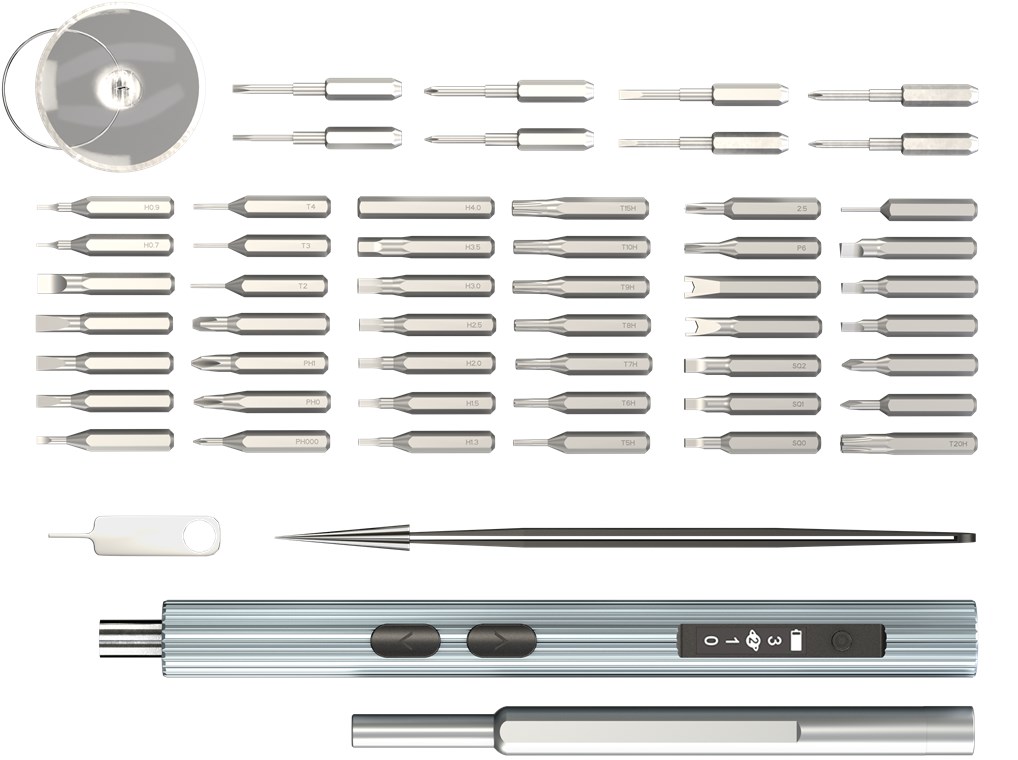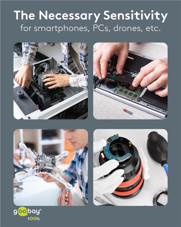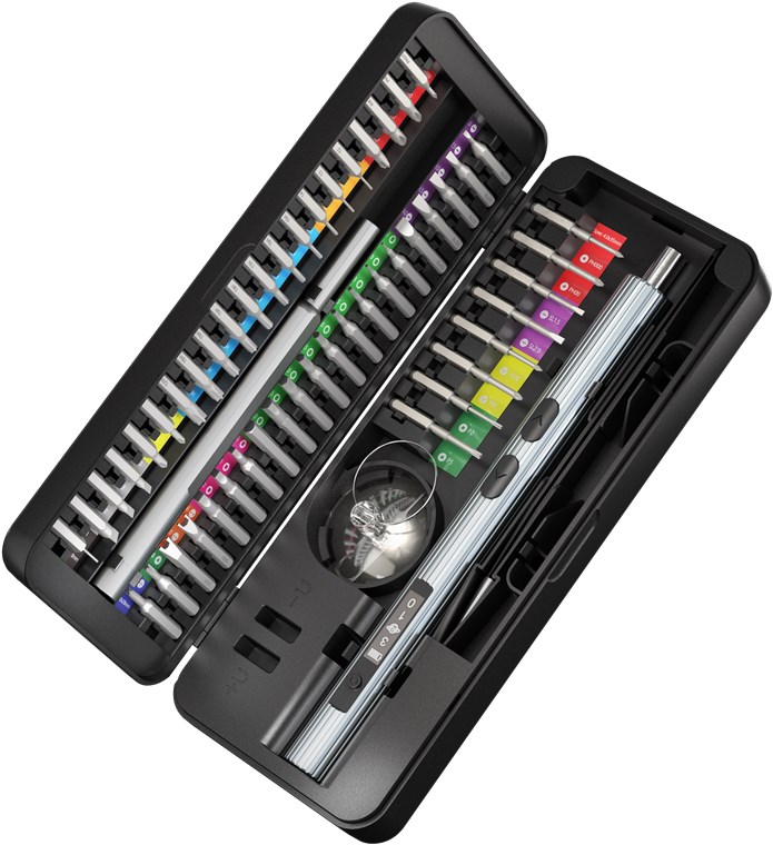 - Included in the screwdriver set: Additional manual screwdriver, suction cup, SIM needle, lever tool (housing opener) and ESD-12 pointed tweezers for precision work.