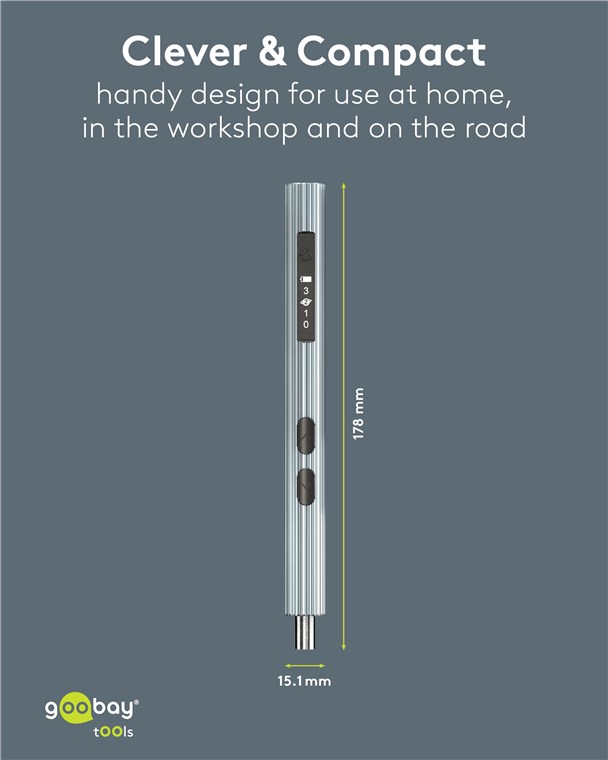 - Well-thought-out design made of high-quality aluminium: The slim cordless screwdriver fits comfortably in the hand and ensures the necessary precision when working on smartphones, laptops, PCs, drones, etc.
