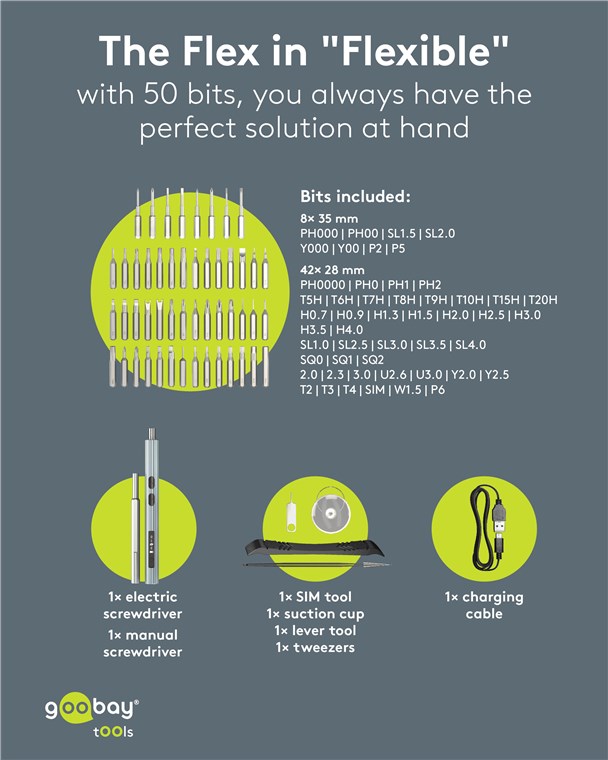 42× 28 mm bits, 8× 35 mm bits, charging cable USB-A to USB-C™, Manual screwdriver & lever, pin, Screwdriver handle with magnetic holder, storage box, suction cup, tweezers