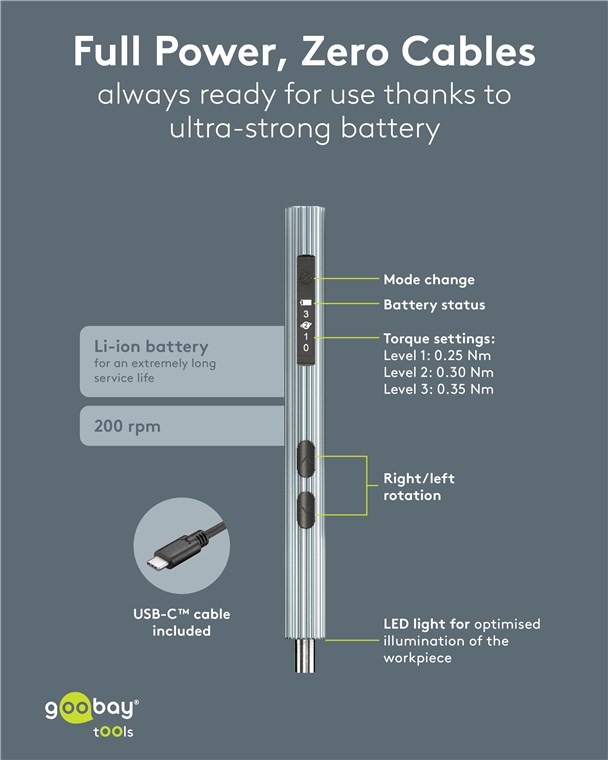 - Screwdriver with USB-Câ„¢ connection for charging, including 0.5 m charging cable (USB-Câ„¢ to USB-A)