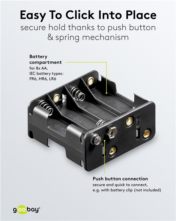 - The Goobay battery holder can be built into or attached to a battery-operated device.
