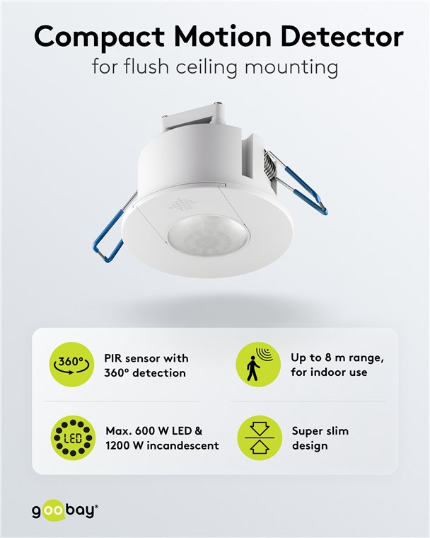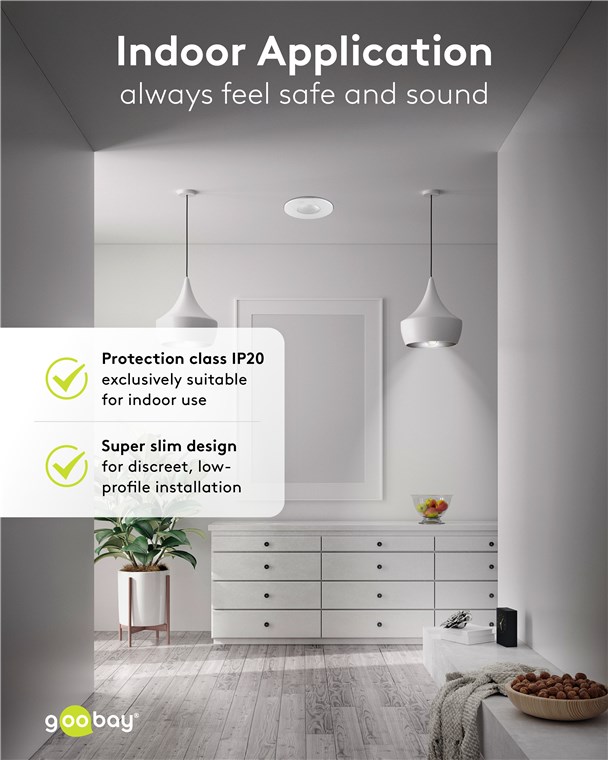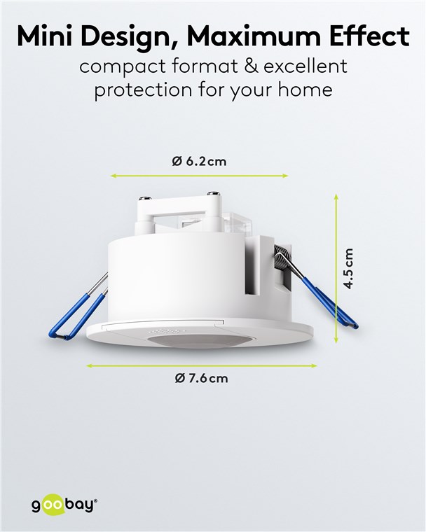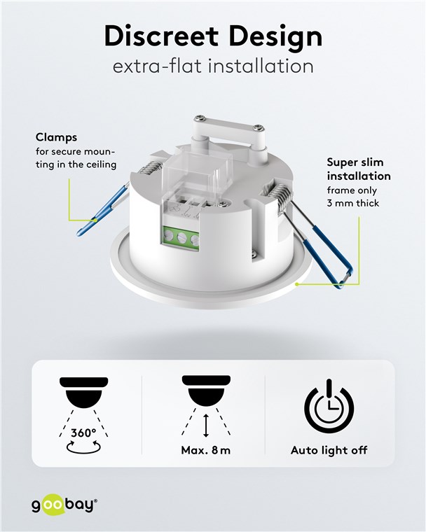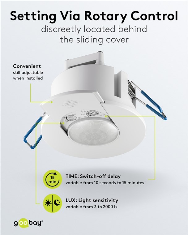 Clever and compact: The motion detector has a diameter of 7.6 cm and protrudes only approx. 5 mm from the ceiling. This makes it the super-flat option among motion detectors and perfect for discreet installation. The white cover conceals the rotary controls, which allow you to easily adjust the light sensitivity and switch-off delay – even after installation.
