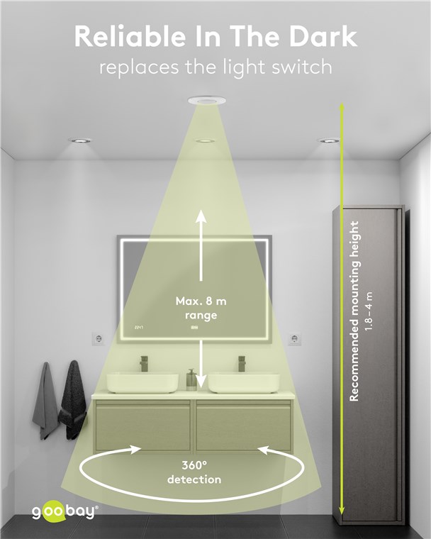 • Replaces the light switch and switches without contact: Particularly practical in rooms that you enter with your hands full, e.g. hallways or utility rooms