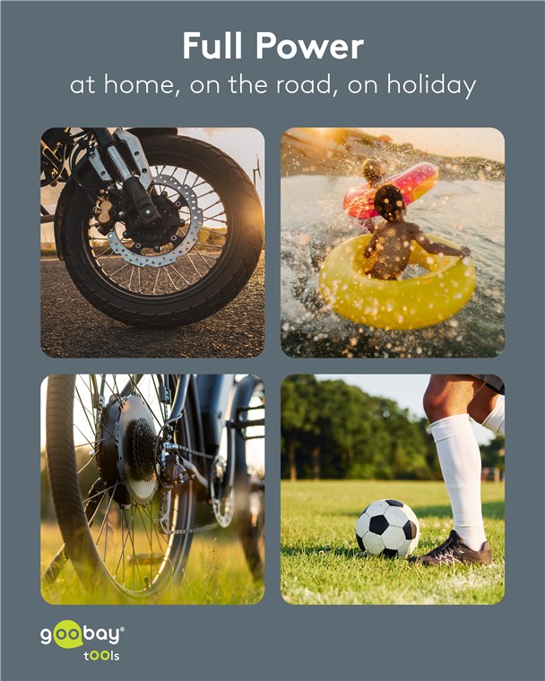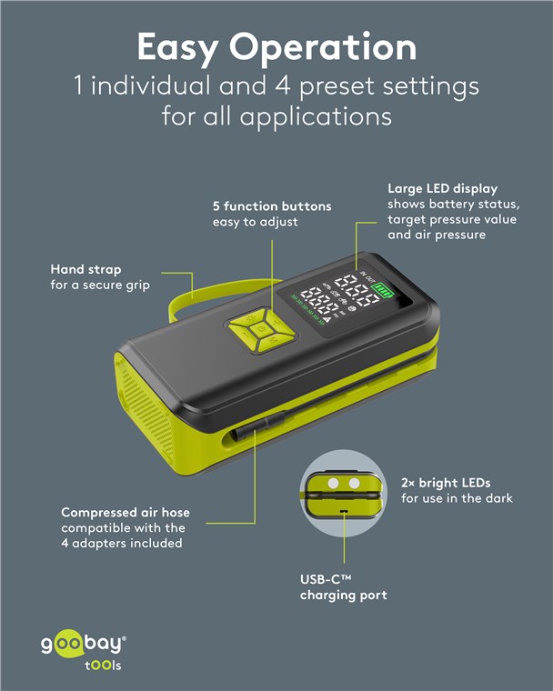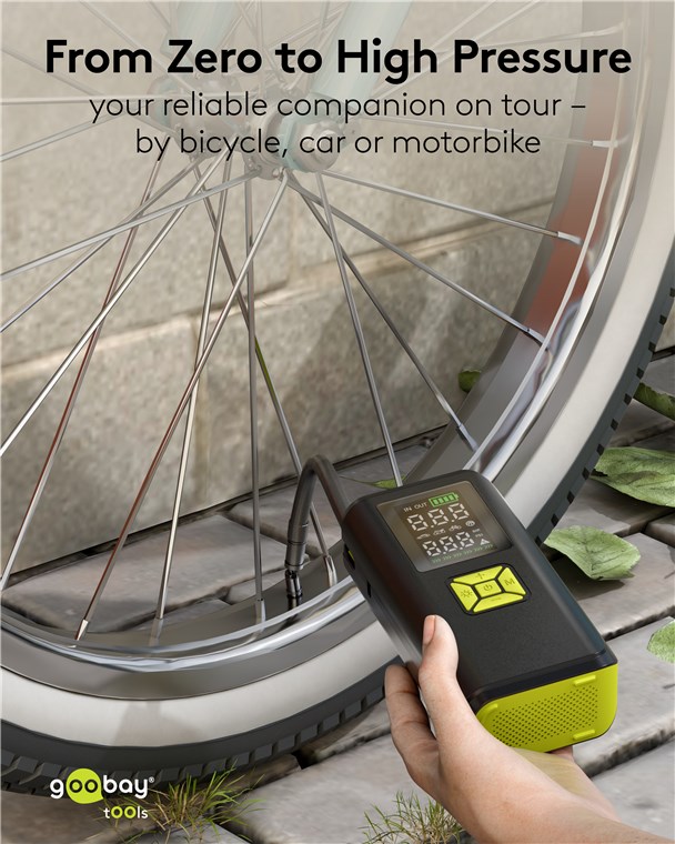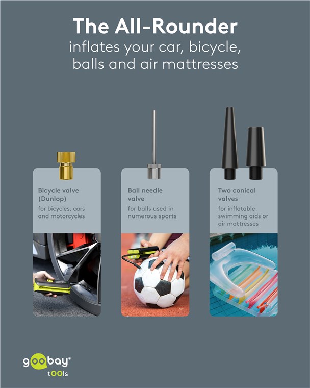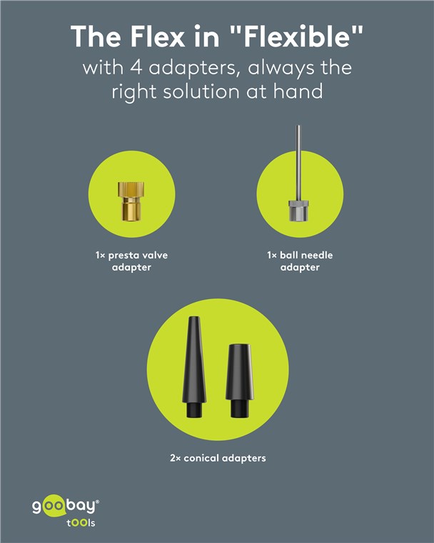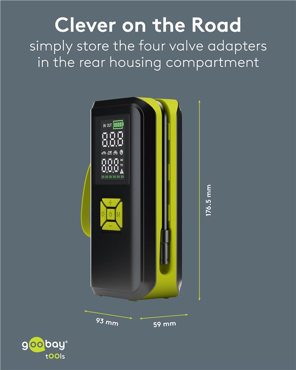 - Perfect as a tyre inflator on the go: The four valve adapters are stored in a practical compartment on the back of the device