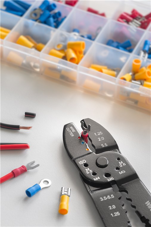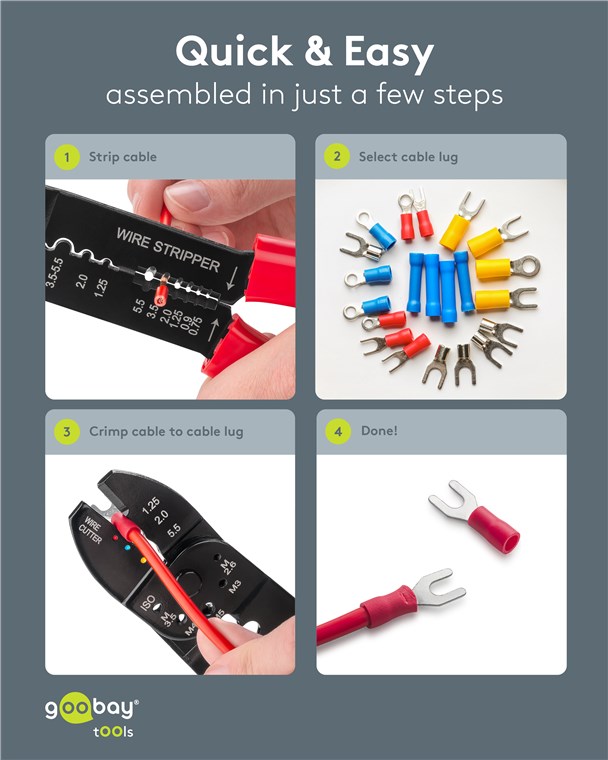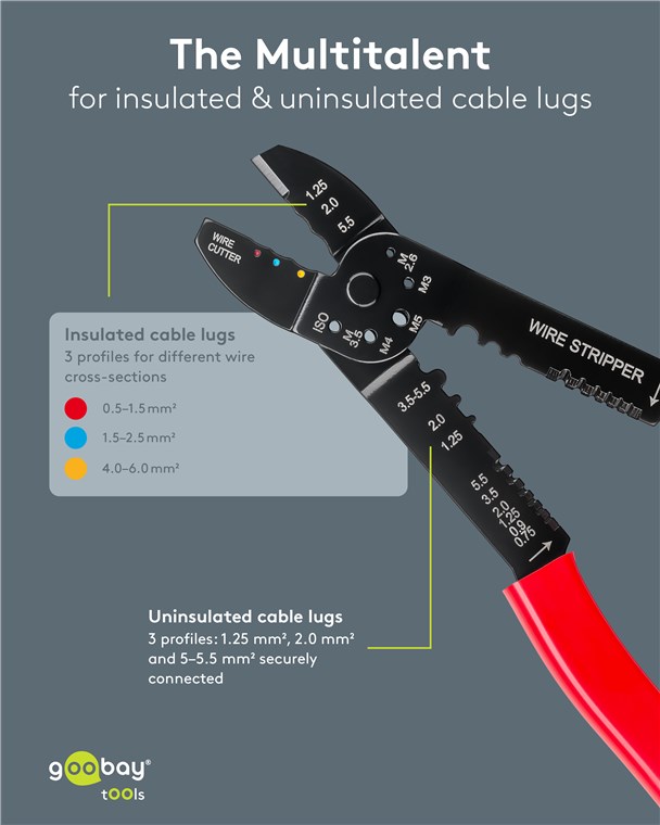 - Crimping pliers for insulated cable lugs, crimp connectors, butt splice connectors with heat shrink tubing, wire end ferrules and blade connectors with a cross-section of 1.25 mm² (red), 2.0 mm² (blue) and 5.5 mm² (yellow)