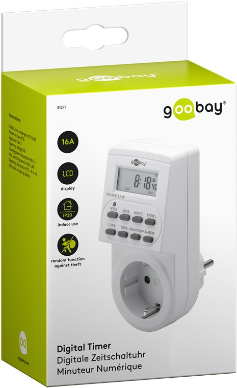 - Digital timer for socket outlet/socket strips for precise control of electronic devices