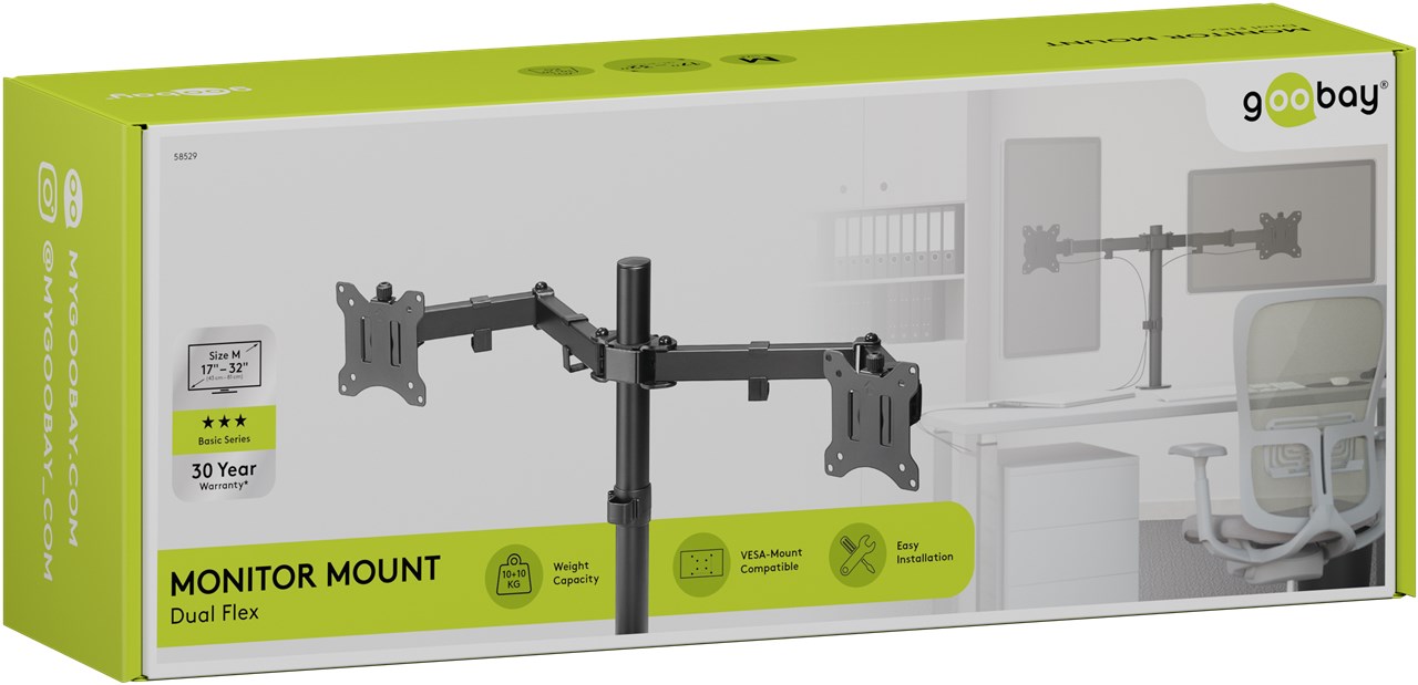 The monitor mount is the perfect addition to the ergonomic workplace and adapts to all of your everyday requirements. Whether mobile office, gaming or multimedia applications: You can easily and flexibly adjust the monitors for an ideal viewing angle. An added benefit: The compact stand creates additional space on the desk and ensures a clean look.