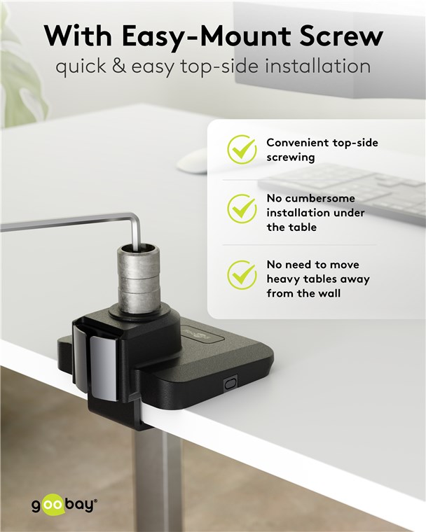 - Installation is quick and easy with the included mounting material, either using a screw with drill hole or a table clamp that can be removed without leaving any residue