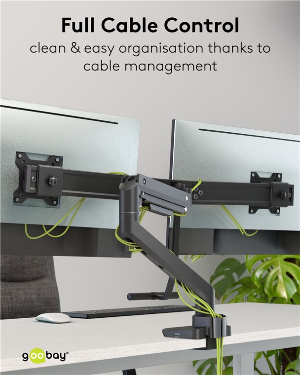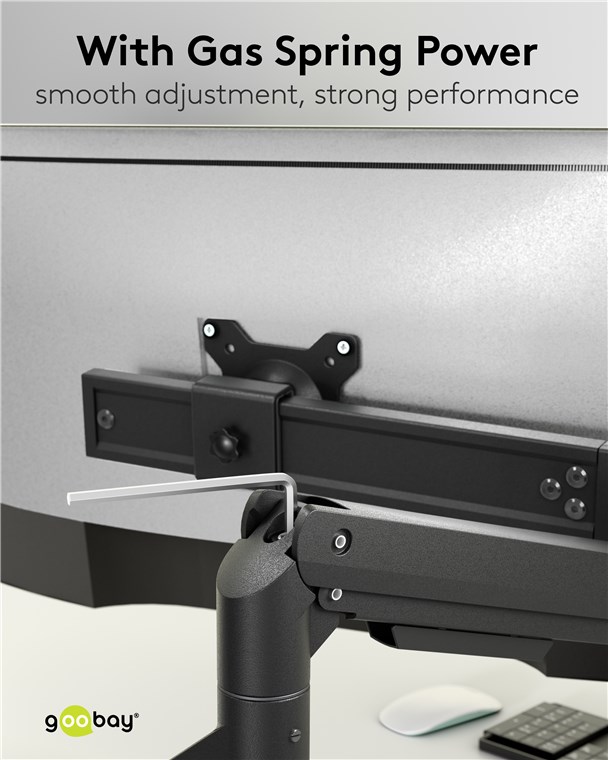 The monitor mount is the perfect addition to the ergonomic workplace with two monitors: Using the handle, the monitors move synchronously – and always remain parallel. Supported by the high-quality gas pressure spring mechanism, the movement is fluid and absolutely effortless. As a special extra, the integrated cable management system ensures a clean look.