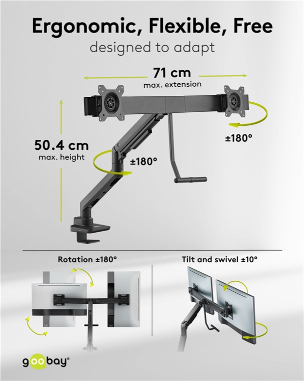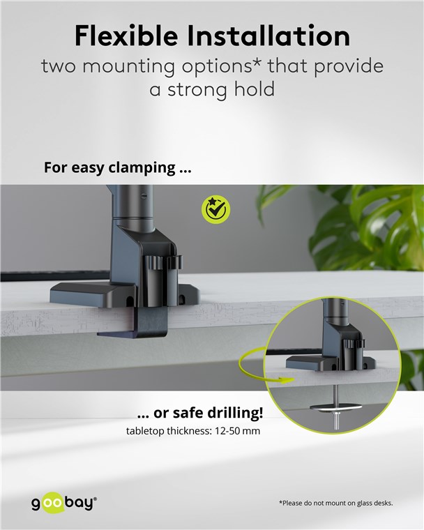 - Perfect for stable table mounting of two screens up to 9 kg each, height-adjustable, ±10° swivelling and ±10° tilting, 180° rotation, recommended tabletop thickness: 12-50 mm