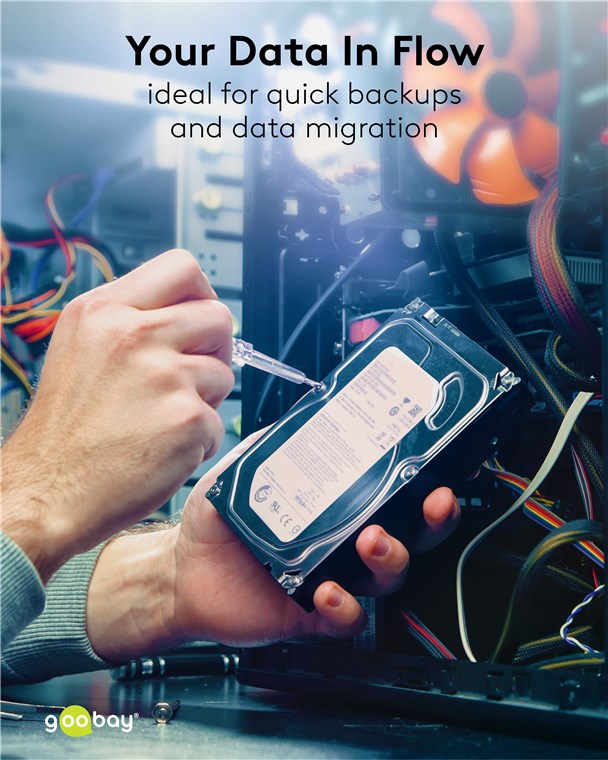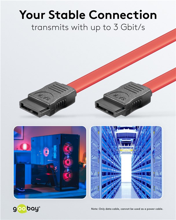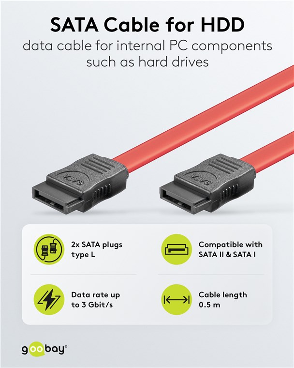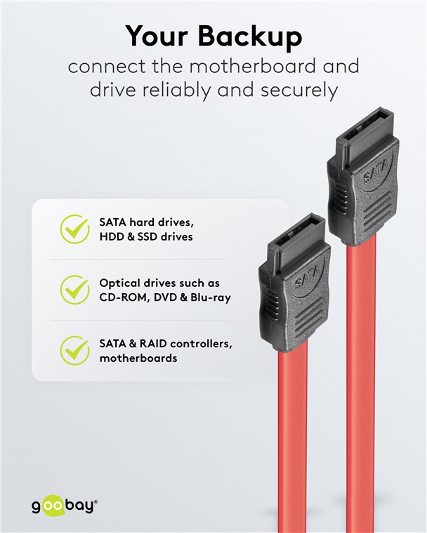 - SATA cable for connecting internal hard disks, HDD, SDD, CD-ROM, DVD and Blu-ray drives to SATA controllers, RAID controllers or motherboards