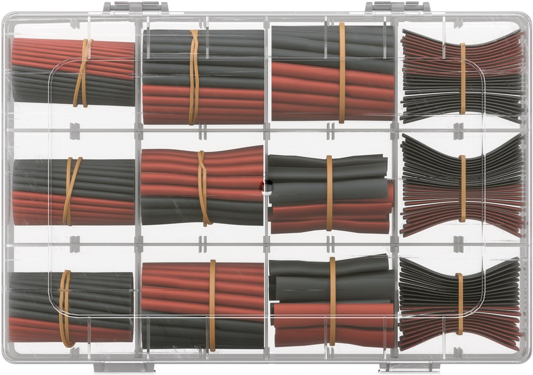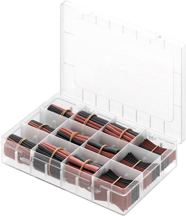 • The heat-shrink tubing assortment is supplied in a neatly organised plastic box with a practical hanging tab and a printed overview on the inside of the lid