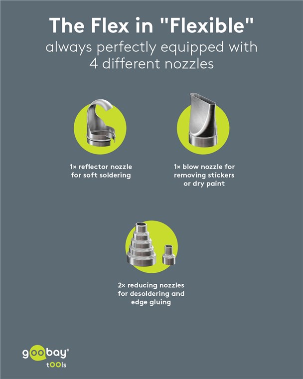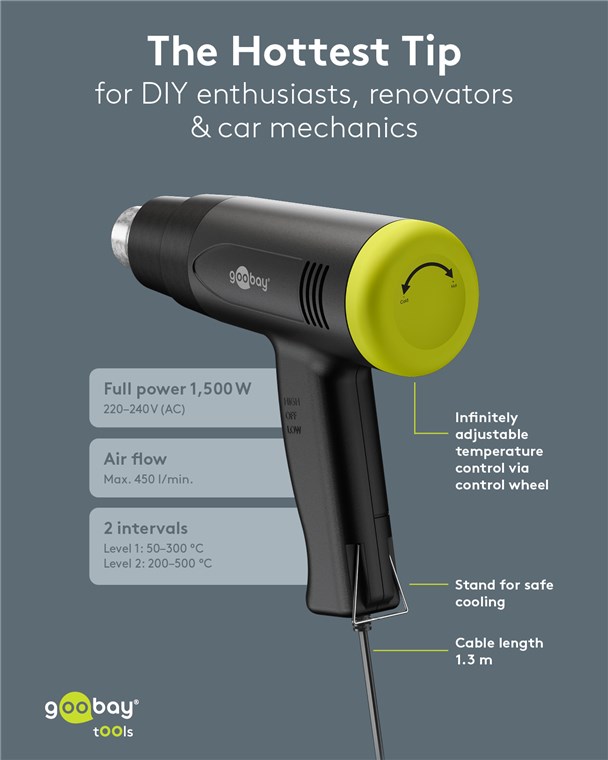 The hot air gun is the hottest tip in the DIY sector. Flexible in use with four different nozzles, it is the handy helper for numerous repair jobs and crafts, e.g. for extending cables with heat-shrink tubing and for desoldering and reshaping thin metal or plastic pipes.