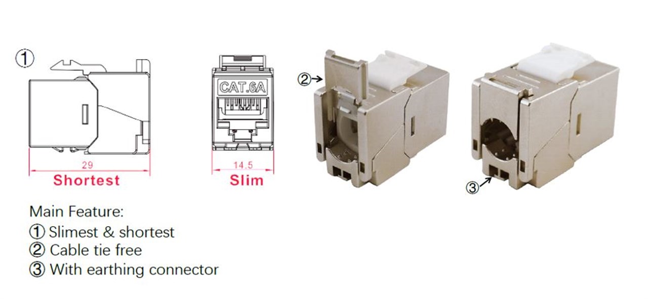 Keystone Module RJ45 CAT 6A, STP, Slim & Short, Earthing Terminal