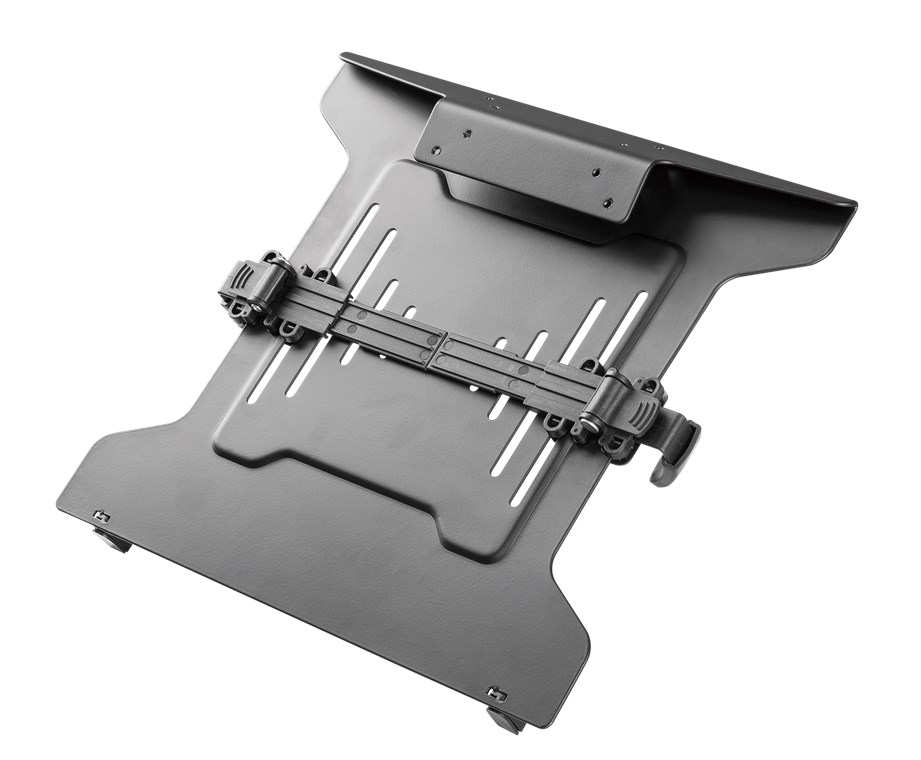 - Practical, robust metal laptop mount for monitor arms with VESA-compatible mounting plates
