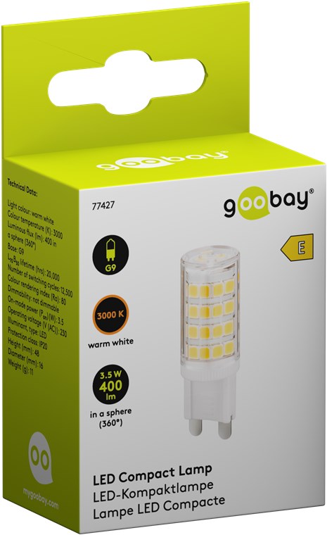 - With 3.5 W output, the Goobay LED lamp is just as bright as a 40 W incandescent lamp, but consumes approx. 88 % less energy