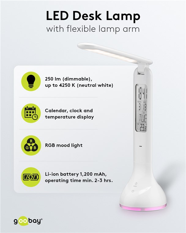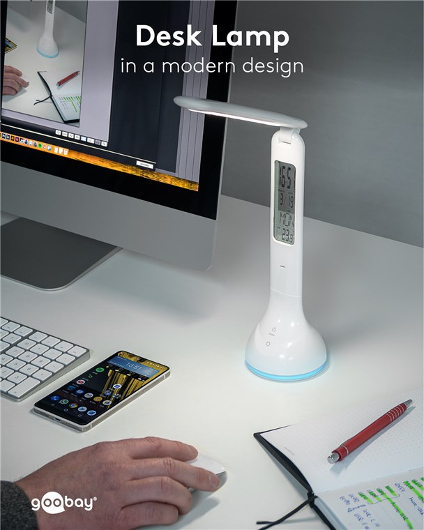 - Modern design LED desk light with RGB mood light, calendar, clock with alarm function and temperature display