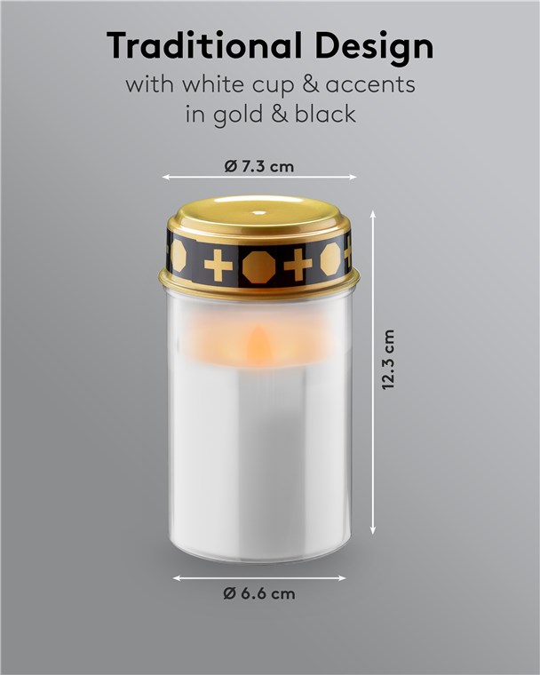 - The grave light is suitable for indoor and outdoor use - thanks to its IP44 protection rating and the waterproof battery compartment inside the candle