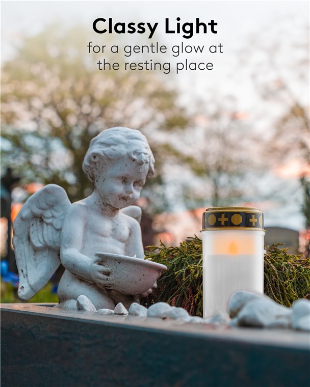 The grave candle creates an atmosphere of warmth and devotion in the cemetery, at resting places and memorials, especially at dusk and in the darker months of the year. The gently glowing light not only accompanies you in moments of remembrance, but also withstands wind and weather - for a reliable, long-lasting light at the final resting place.