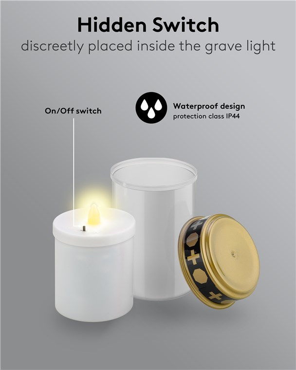 - With discreet on/off switch placed next to the LED inside the grave candle, reachable via the removable lid