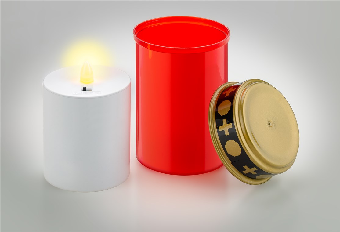 - With discreet on/off switch placed next to the LED inside the grave candle, reachable via the removable lid