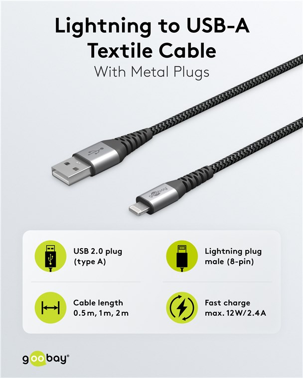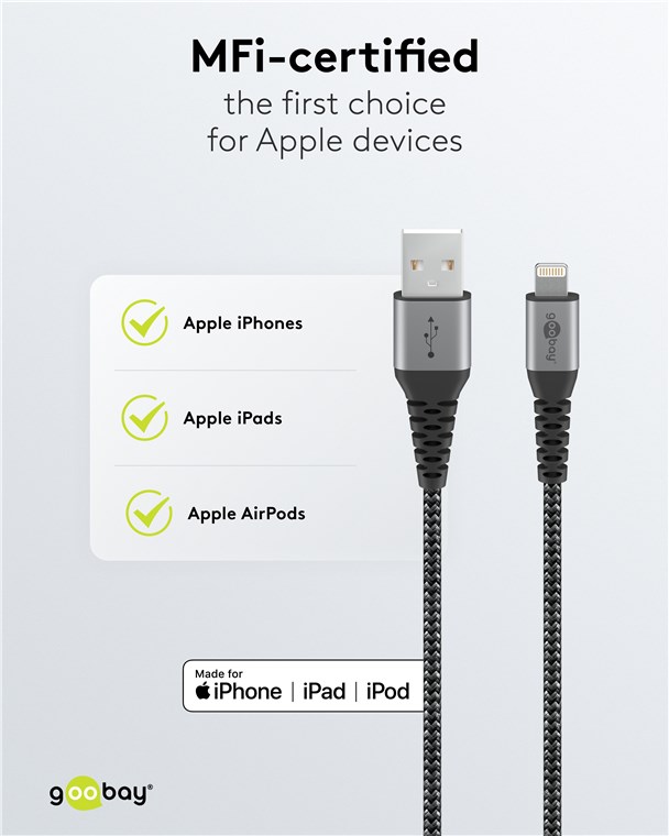 - The Goobay Lightning charging cable for super-fast charging and hi-speed data transfer of up to 480 Mbit/s