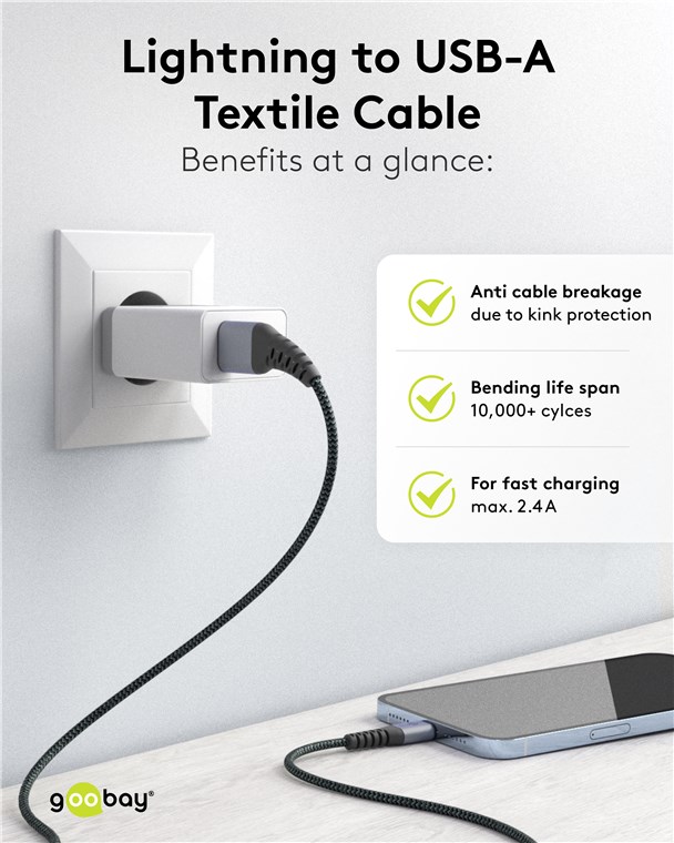 - The braided textile cover of the Goobay USB-A charging cable is pleasant to the touch and gentle on sensitive surfaces
