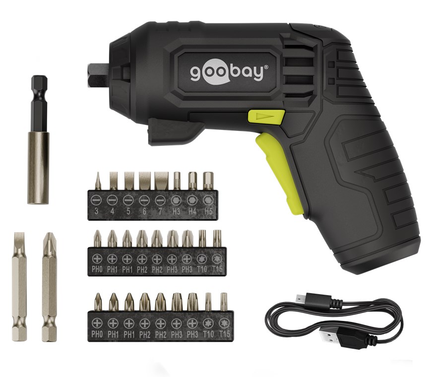 Scope of delivery 27 bits, bit extension, charging cable USB-C™ to USB-A, Cordless screwdriver