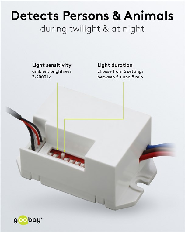 - Light sensitivity (3 lx to 2000 lx) and switch-off delay in 6 stages (5 s to 8 min) are easy to set behind the cover using a DIP switch