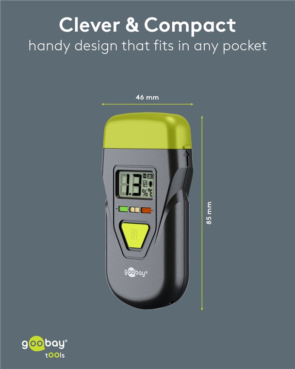 • Ultra-compact moisture meter with 2 modes for precise moisture detection in wood or cardboard (6-60 %) and solid materials such as concrete or plaster (0.2-2.9 %)