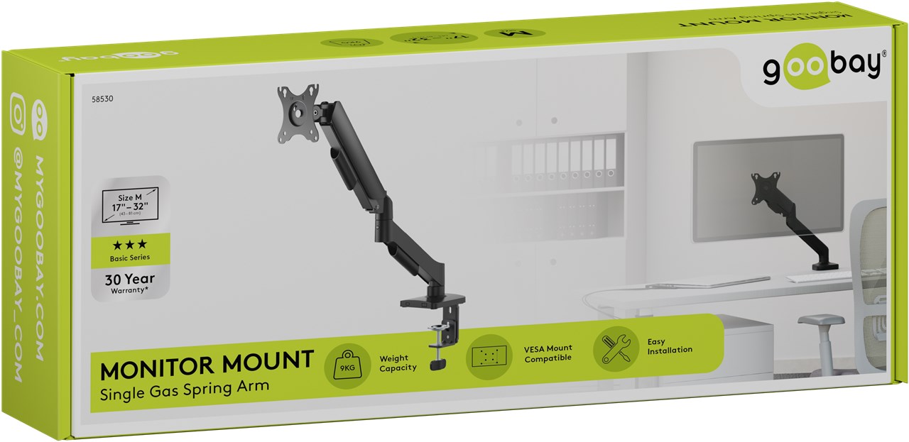 The monitor mount is the perfect addition to the ergonomic workplace and adapts to all of your everyday requirements. Whether mobile office, gaming or multimedia applications: With the high-quality gas spring mechanism, you can flexibly align the monitor arm - effortlessly and at any time. The compact stand creates additional space on the desk and ensures a clean look.