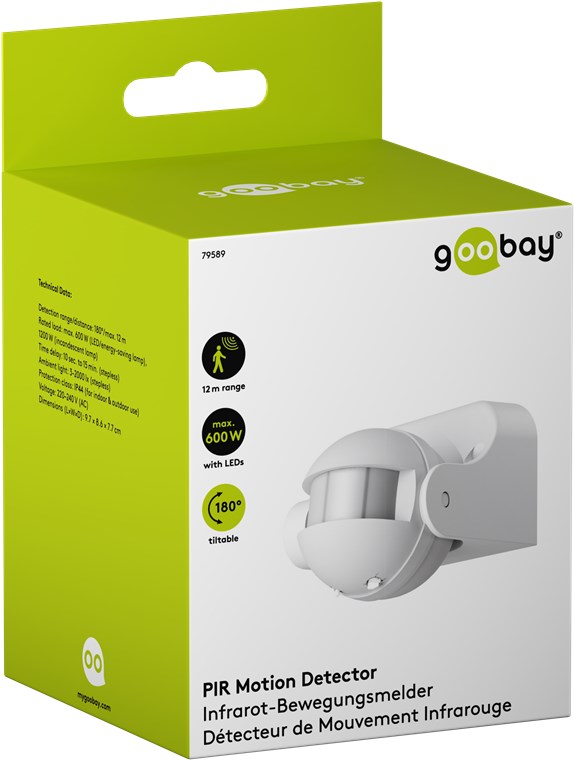 Wind and weather? No problem, the motion detector is IP44-rated, making it perfect for outdoor areas such as gardens, carports or house entrances. Simply connect it to path or outdoor lighting to avoid tripping hazards at dusk and in the dark. Motion detectors from Goobay – always feel safe and sound.