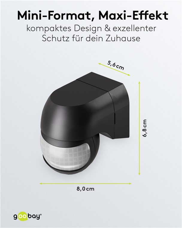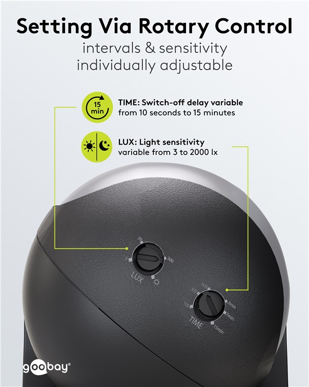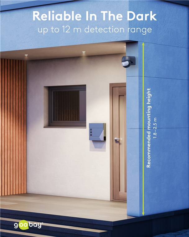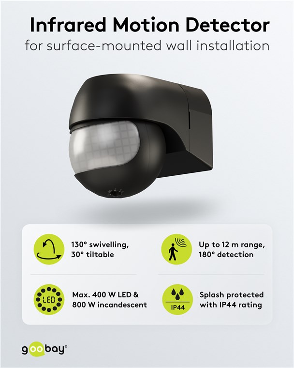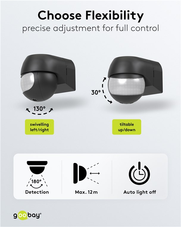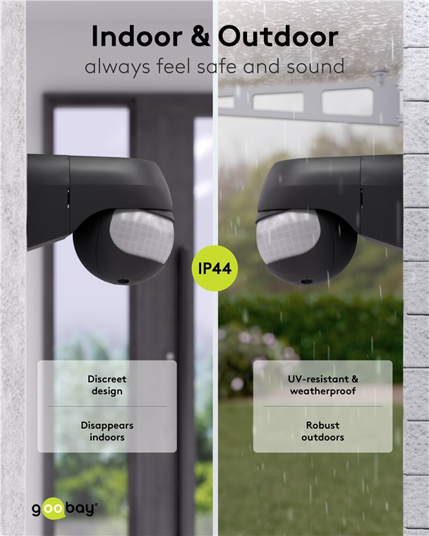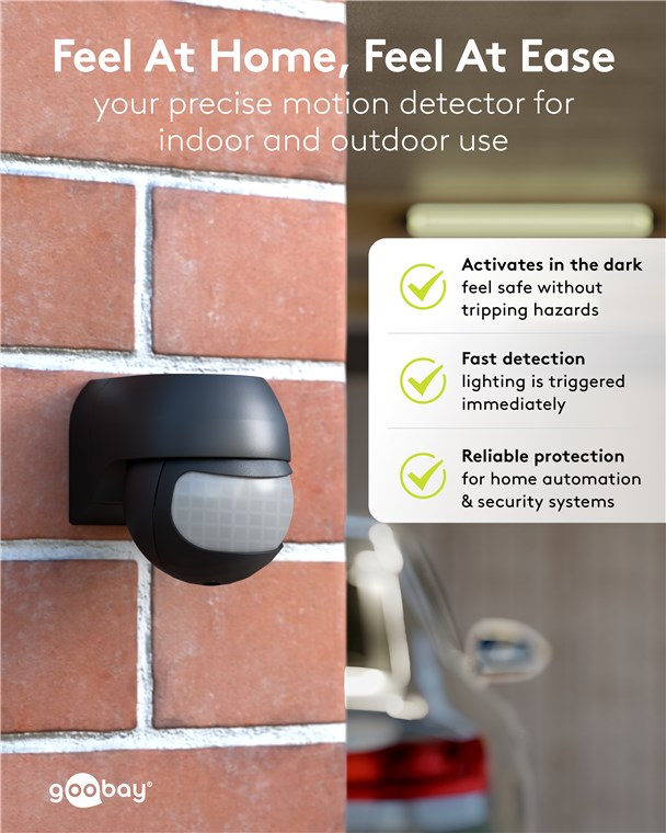 Wind and weather? No problem, the motion detector is IP44-rated, making it perfect for outdoor areas such as gardens, carports or house entrances. Simply connect it to path or outdoor lighting to avoid tripping hazards at dusk and in the dark. Motion detectors from Goobay – always feel safe and sound.