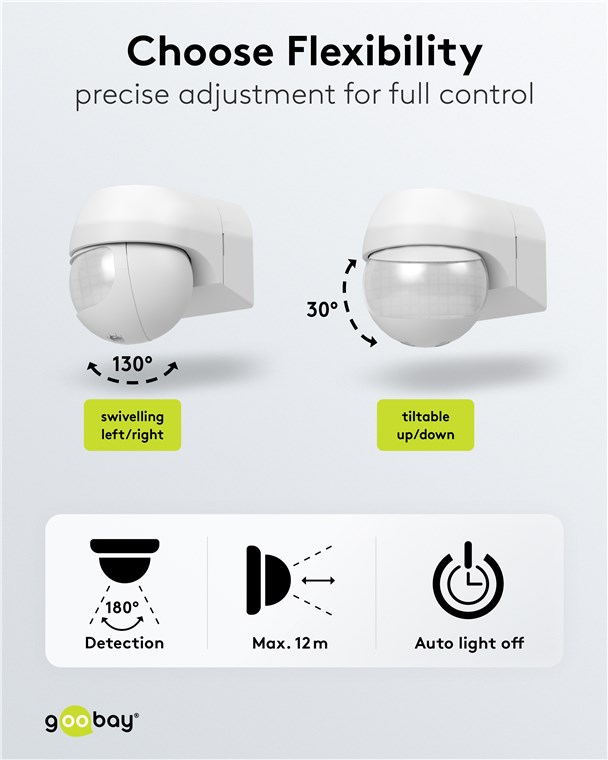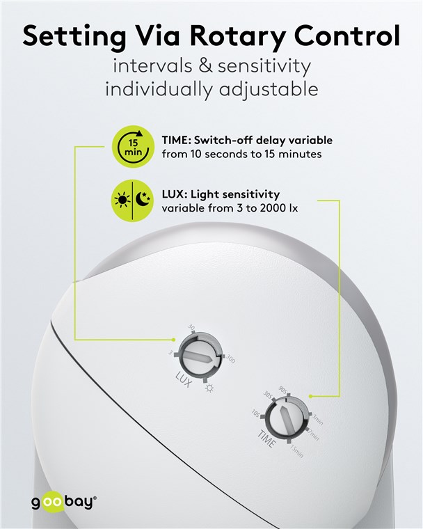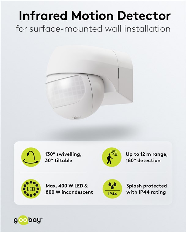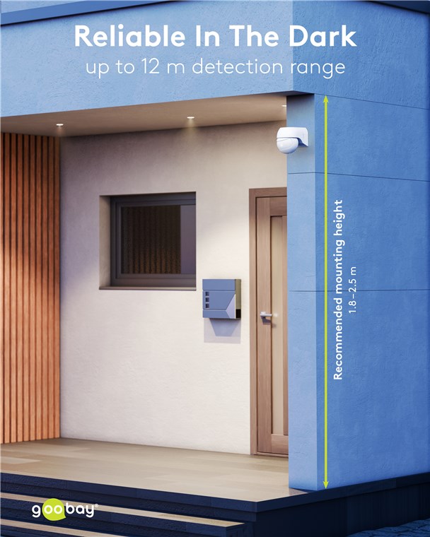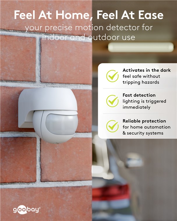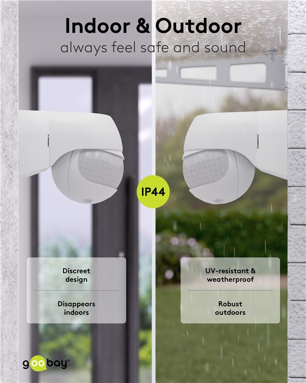 Wind and weather? No problem, the motion detector is IP44-rated, making it perfect for outdoor areas such as gardens, carports or house entrances. Simply connect it to path or outdoor lighting to avoid tripping hazards at dusk and in the dark. Motion detectors from Goobay – always feel safe and sound.