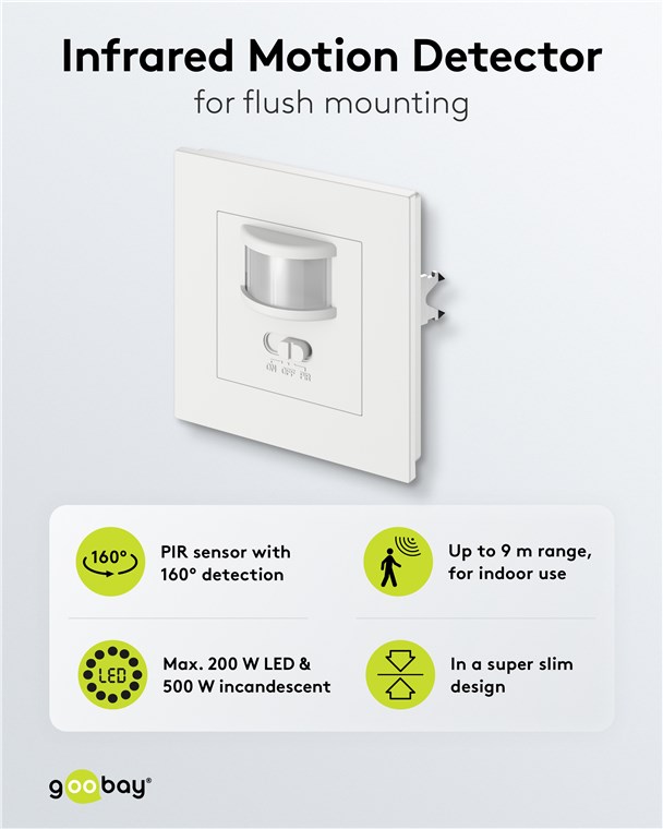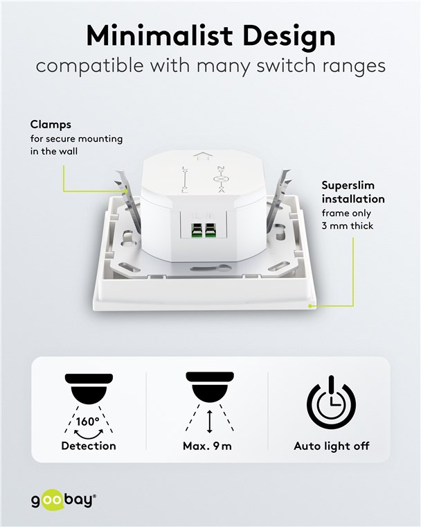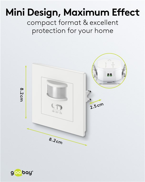 Perfectly integrated into your interior design: The motion detector is installed super-flat in a wall box and, with its simple, square design, fits in with many common switch ranges. You can conveniently switch the sensor on and off as required using the front switch.