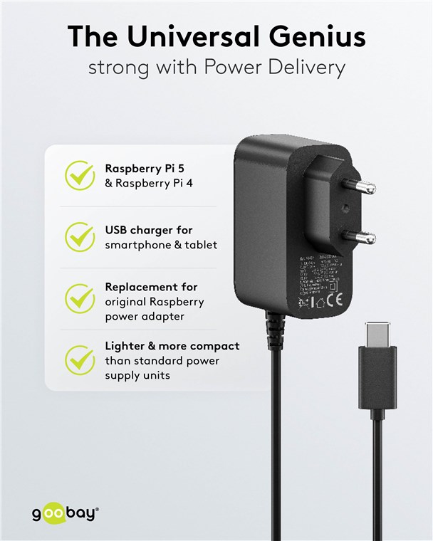 So fresh, so slim: Just as powerful as an original power supply for the Raspberry Pi 5 and almost as compact. The new plug-in power supply from Goobay simply leaves other power adapters in the dust. With a power output of up to 27 W, it can handle all the challenges your Raspberry throws at it – even when you connect power-hungry devices such as external hard drives, HATs or PCIe™ graphics cards to the mini computer.