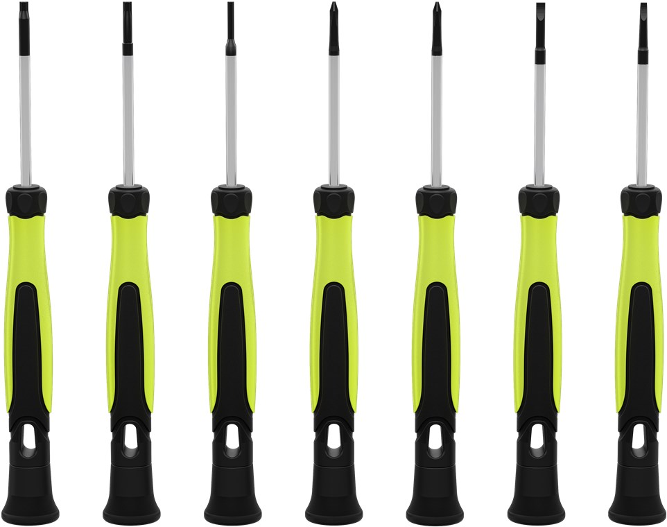 7 screwdrivers (2× flathead (2 mm, 3 mm), 3× Phillips (PH0, PH1), 3× Torx (T6, T8, T10)), storage box