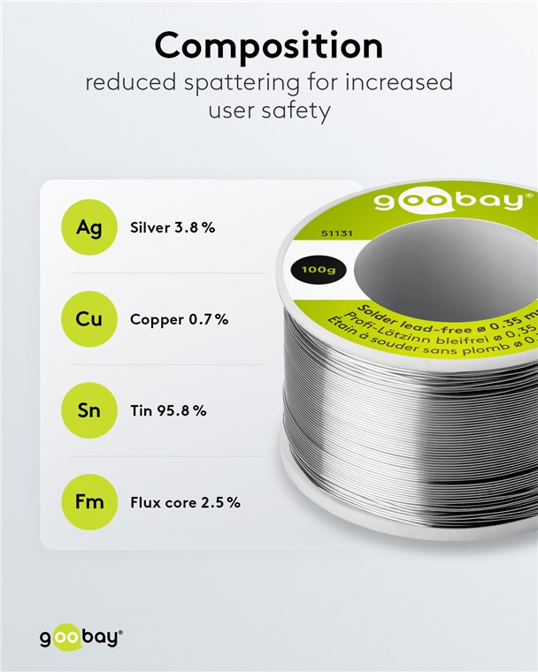 Suitable for soldering work on electrical components and devices such as circuit boards, PCBs, SMDs, DIP, cables, televisions, headphones or microphones. For especially easy and effective soldering, the flux is already incorporated in the tin.