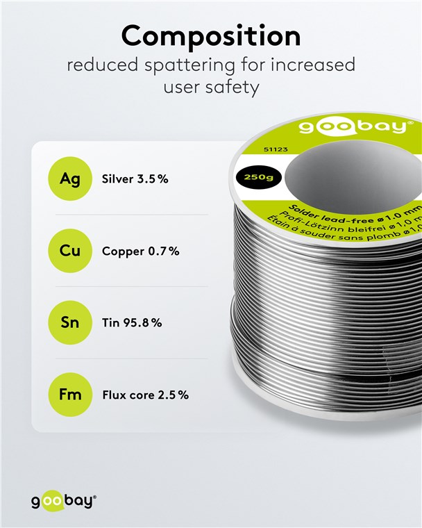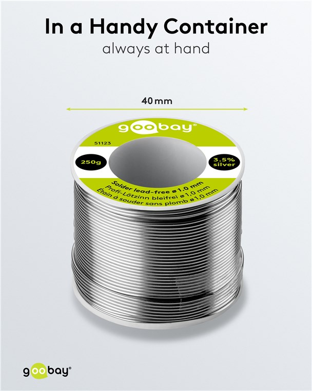 Suitable for soldering work on electrical components and devices such as circuit boards, PCBs, SMDs, DIP, cables, televisions, headphones or microphones. For especially easy and effective soldering, the flux is already incorporated in the tin.
