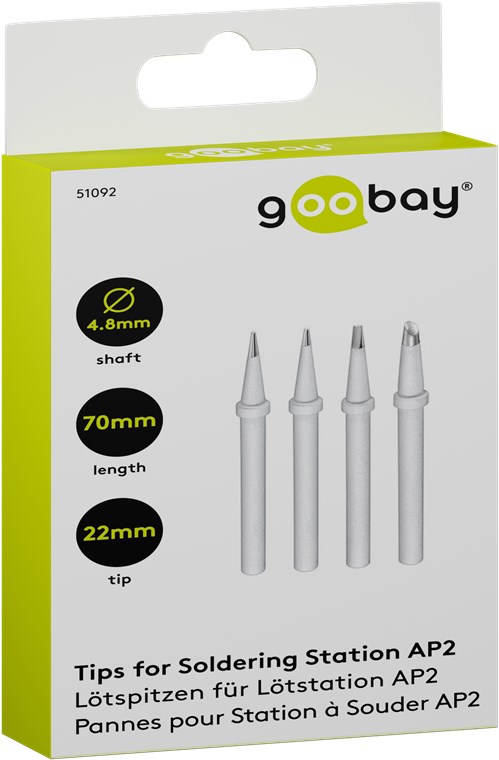 - 1x soldering tip (straight) ø 0.5 mm, 70 mm, collar ø 6.6 mm, shaft ø 4.8 mm, tip: 22 mm