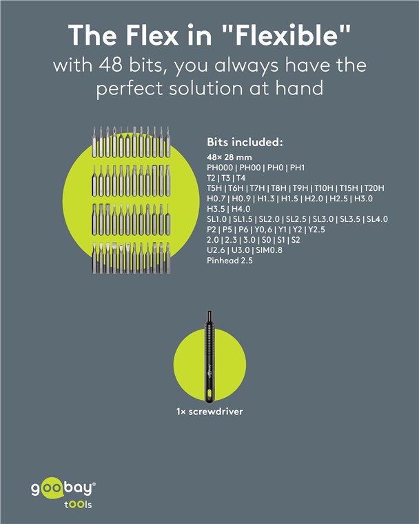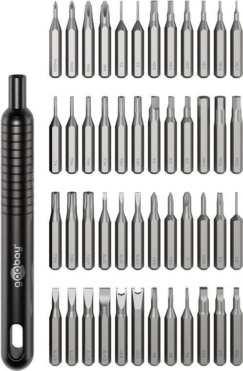 - Includes 48 bits: 4x cross recess (PH), 11x 6-point star (T, TH), 9x hexagon (H), 7x flat slot, 3x 5-point (P), 4x tri-wing, 3x triangular, 3x square socket (S), 2x tension wrench (U), 1x SIM0.8, 1x pinhead 2.5