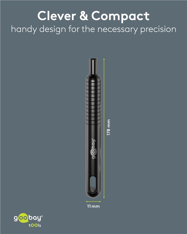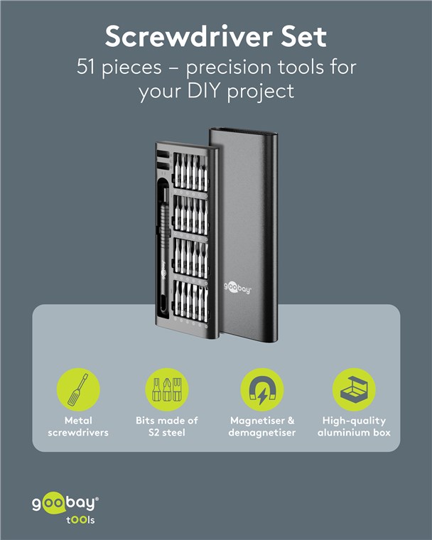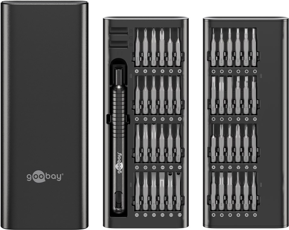 Quality you can feel: The screwdriver set impresses with its matt aluminium housing and colour-coordinated bit holder. The special feature: The case opens with a pop-up mechanism. Unlike conventional hinged boxes, no fasteners break off and the case remains securely closed during transport or storage in a toolbox.
