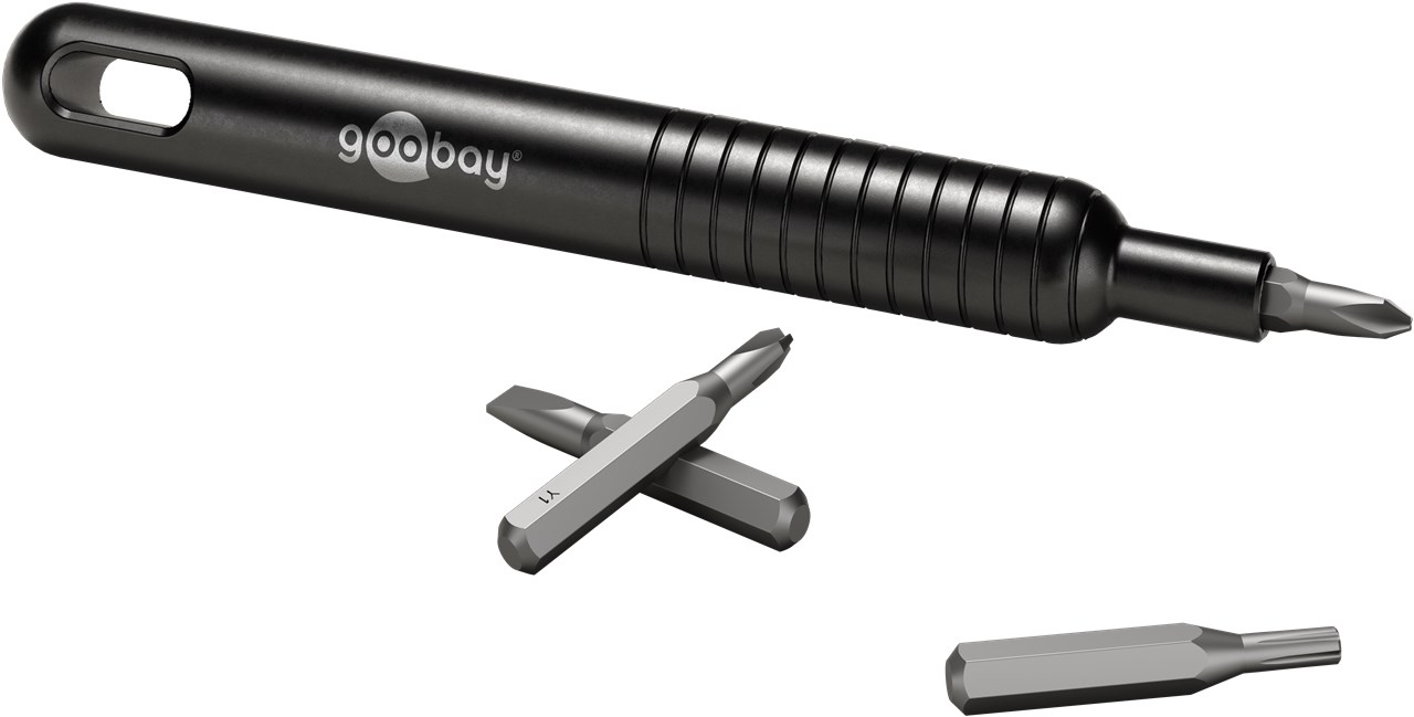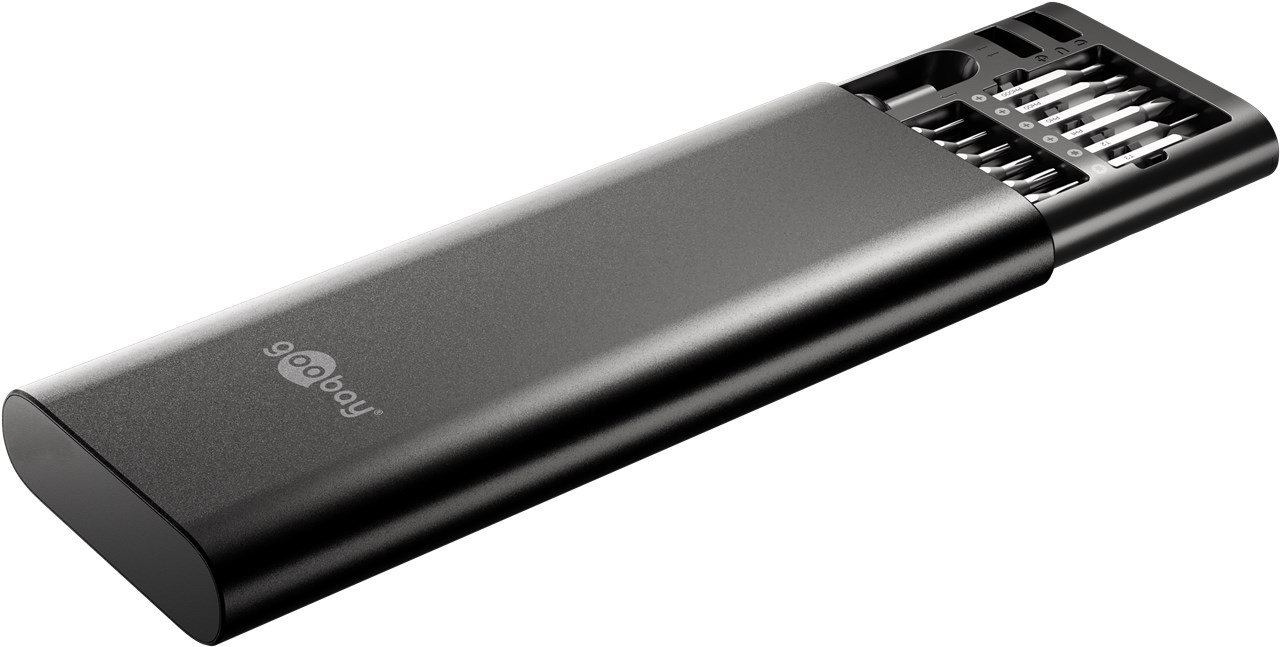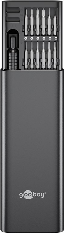 - High-quality, mini screwdriver set made of coated aluminium in a metal case with a convenient pop-up mechanism