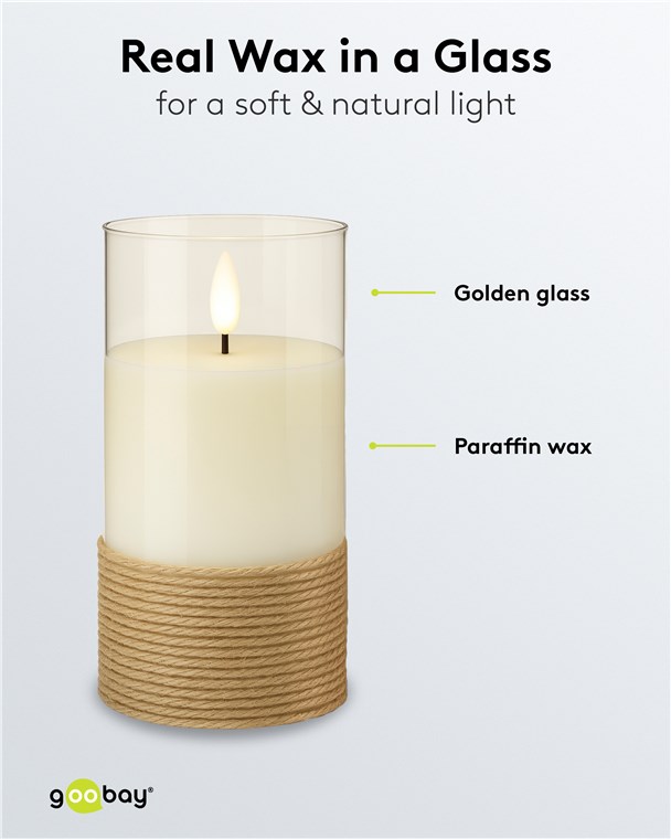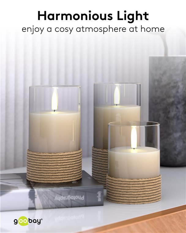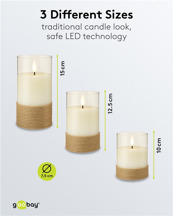 - Stylish pillar candles in three different sizes with a natural-looking, flickering flame in a grey glass in a transparent glass, wrapped in hemp – completely electric and completely safe