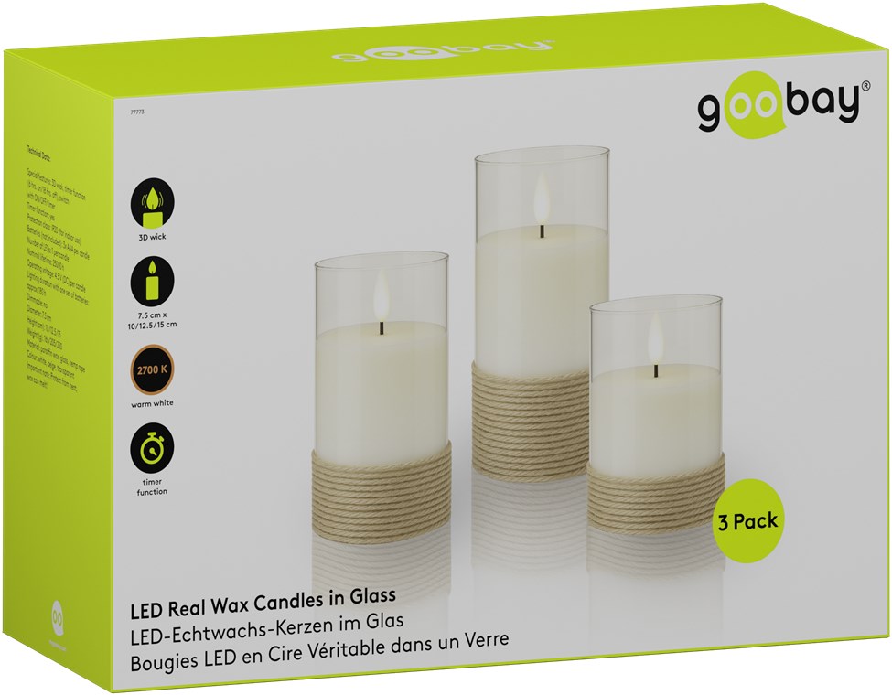 Set of 3 LED Real Wax Candles in Glass, White, Wrapped with Hemp